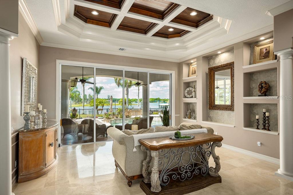 Built-in Features, Ceiling Fans(s), Coffered Ceiling(s), Crown Molding, Dry Bar, High Ceilings, Kitchen/Family Room Combo, Solid Wood Cabinets, Split Bedroom, Stone Counters, Thermostat, Walk-In Closet(s), Wet Bar, Window Treatments